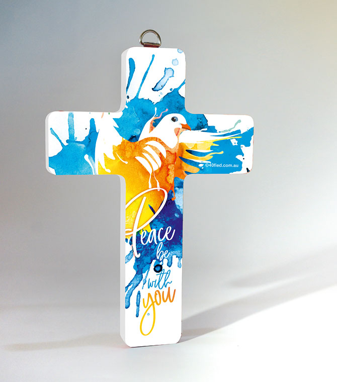 A contemporary colourful cross depicting the Holy Spirit as a dove, fire and water, the scriptural symbols of the Holy Spirit.