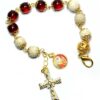 The white lava beads resemble the porous texture of bread and the transparent red glass beads the wine. Each time you pray while wearing this rosary bracelet, you remember Christ as He gave His body and blood for our salvation.